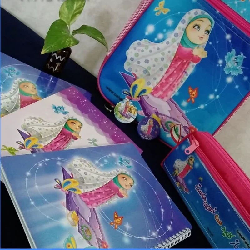 کیف مدرسه با ست جامدادی و دفتر و دفترچه کیف دبستان دخترانه کوله مدرسه طرح مذهبی