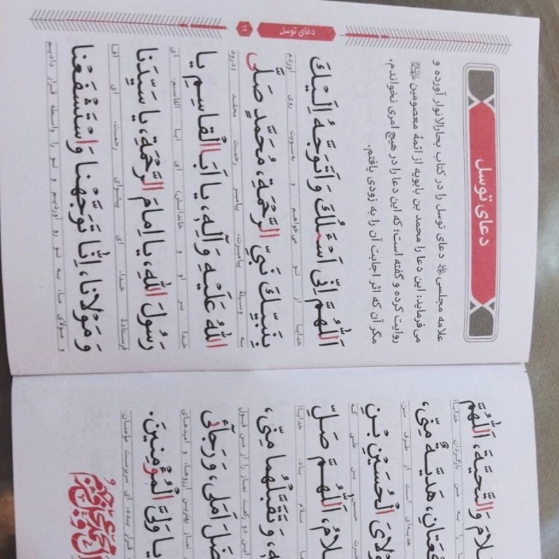 زیارت عاشورا دعای توسل وحدیث کسا نیم جیبی جلدقرمز طلایی تعداد ص48 نشر شش گوشه حروف ناخوانا قرمز رنگ درشت خ