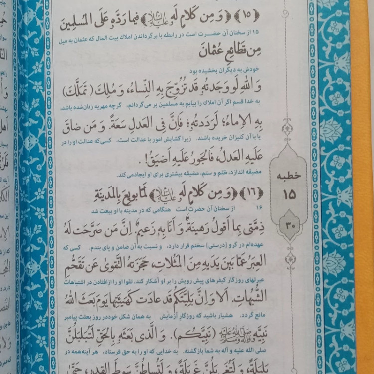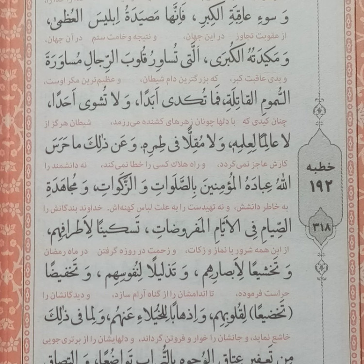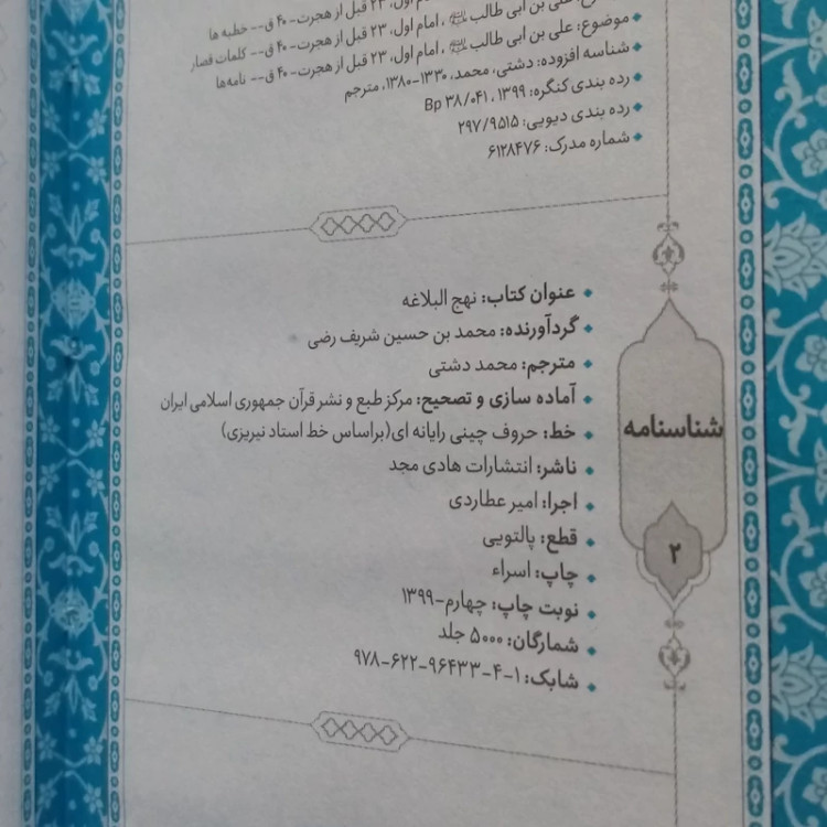 نهج البلاغه پالتویی با جلد چرم وتزئین سوخت چرم.کاغذ نفیس و نازک. حاشیه رنگی. متن رنگی. نوشته های نسبتا درشت. خوش خط. با ترجمه ی محمد دشتی نشانه دار
