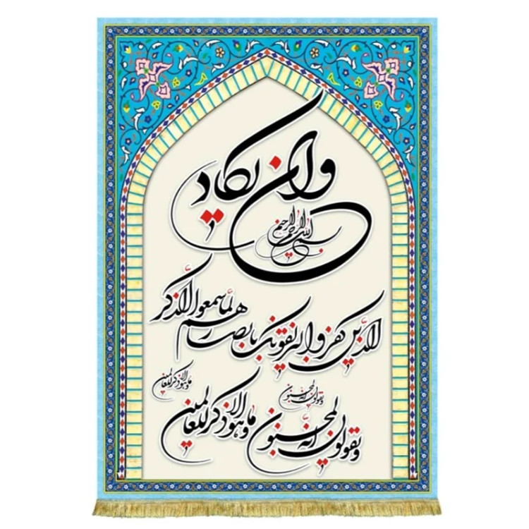 کتیبه ( پرچم ) مخمل آیه و ان یکاد یا آیه چشم زخم که به آسیب رساندن کافران از طریق چشمزخم به پیامبر (ص) پس از شنیدن قرآن اشاره دارد. ( آیه 51 و 52 سوره قلم - وَإِن يَكَادُ ٱلَّذِينَ كَفَرُواْ لَيُزۡلِقُونَكَ بِأَبۡصَٰرِهِمۡ لَمَّا سَمِعُواْ ٱلذِّكۡرَ وَيَقُولُونَ إِنَّهُۥ لَمَجۡنُونٞ {51} وَ مَا هُوَ إِلَّا ذِكۡرٞ لِّلۡعَٰلَمِينَ {52} - البته نزديك است كه كافران به چشمان {بد} خود {چشم زخمت زنند و} از پايت در آورند، آن گاه كه آيات قرآن بشنوند و {چون در فصاحتش حيرت كنند از شدت حسد} گويند كه اين شخص عجب ديوانه است. و حال آنکه قرآن جز یاد و پندي براى جهانیان نیست. ) - مناسب منازل و هیئات مذهبی که در ابعاد مختلف قابل سفارش است. استفاده شده از پارچه مخمل قابل شستشو با بهترین کیفیت چاپ و پارچه، همراه با دور دوزی و ریشه دوزی می باشد