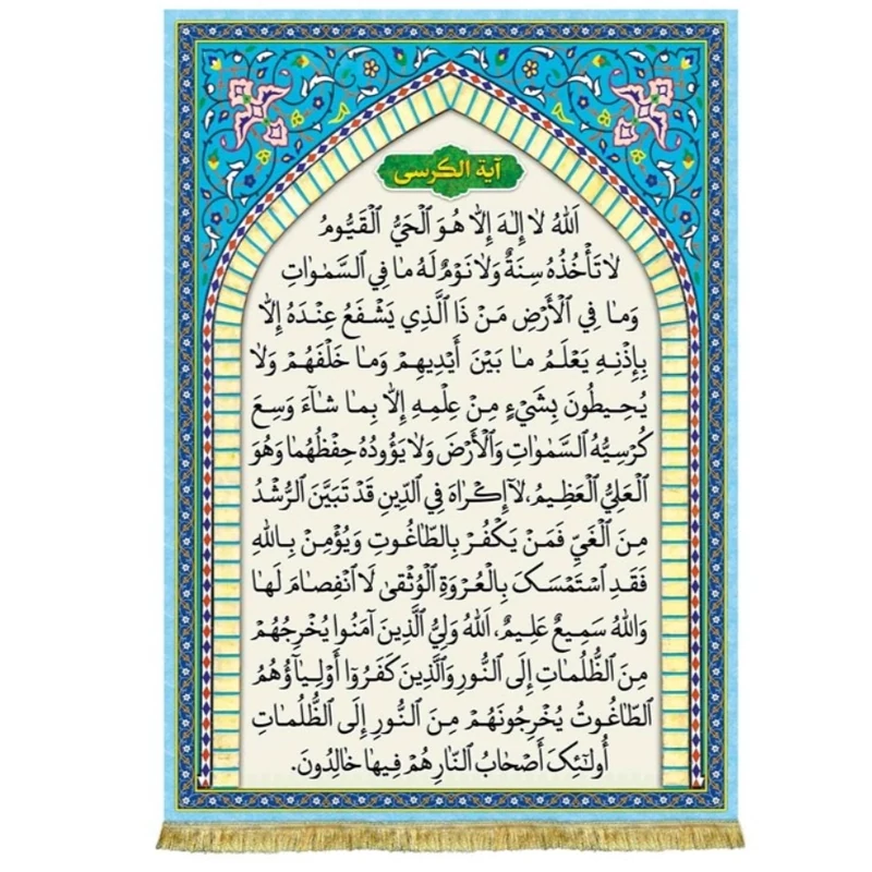 کتیبه ( پرچم ) مخمل آیه و ان یکاد یا آیه چشم زخم که به آسیب رساندن کافران از طریق چشمزخم به پیامبر (ص) پس از شنیدن قرآن اشاره دارد. ( آیه 51 و 52 سوره قلم - وَإِن يَكَادُ ٱلَّذِينَ كَفَرُواْ لَيُزۡلِقُونَكَ بِأَبۡصَٰرِهِمۡ لَمَّا سَمِعُواْ ٱلذِّكۡرَ وَيَقُولُونَ إِنَّهُۥ لَمَجۡنُونٞ {51} وَ مَا هُوَ إِلَّا ذِكۡرٞ لِّلۡعَٰلَمِينَ {52} - البته نزديك است كه كافران به چشمان {بد} خود {چشم زخمت زنند و} از پايت در آورند، آن گاه كه آيات قرآن بشنوند و {چون در فصاحتش حيرت كنند از شدت حسد} گويند كه اين شخص عجب ديوانه است. و حال آنکه قرآن جز یاد و پندي براى جهانیان نیست. ) - مناسب منازل و هیئات مذهبی که در ابعاد مختلف قابل سفارش است. استفاده شده از پارچه مخمل قابل شستشو با بهترین کیفیت چاپ و پارچه، همراه با دور دوزی و ریشه دوزی می باشد