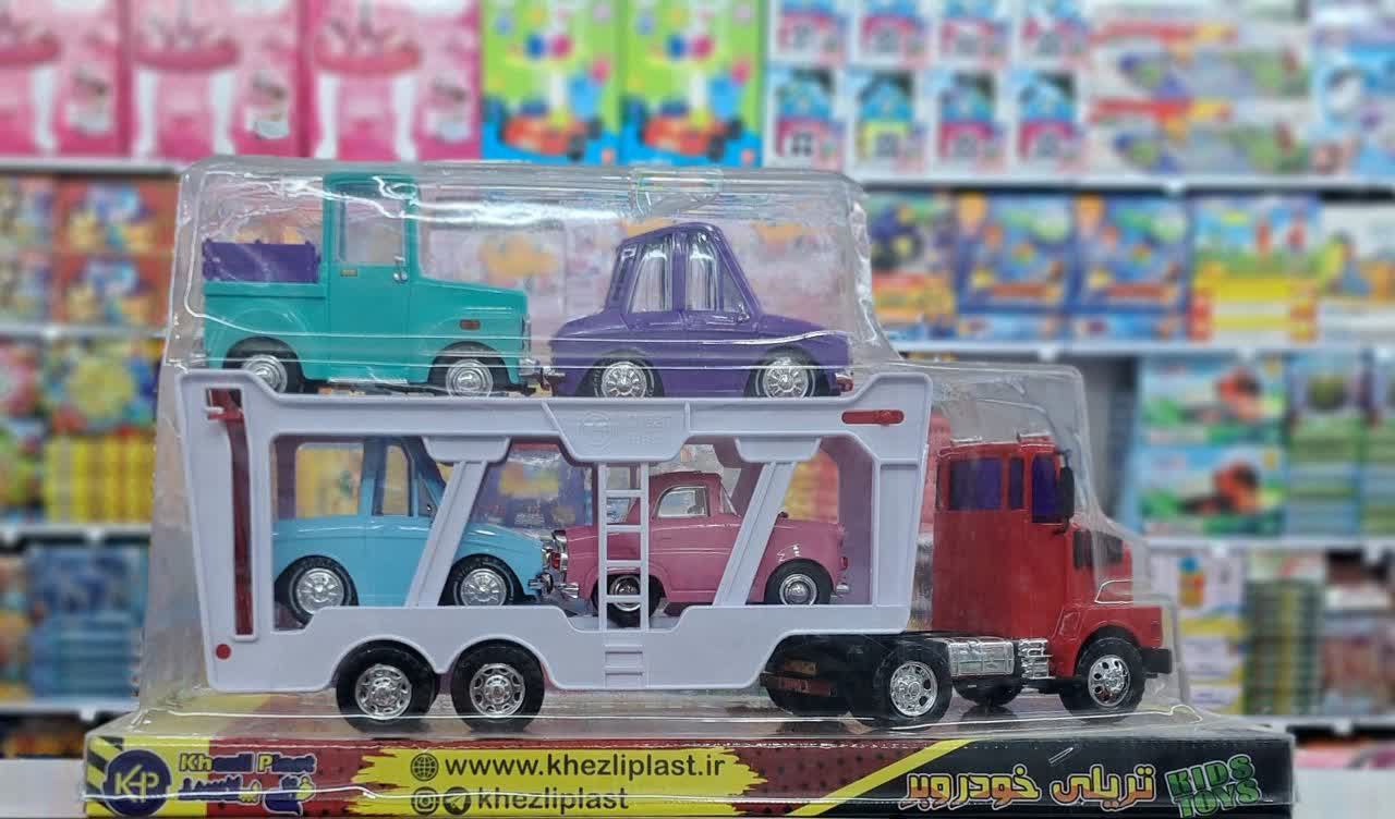 کامیون تریلر خودروبر راشا مدل حمل وروجک به همراه ۴ عدد ماشین فانتزی رنگارنگ